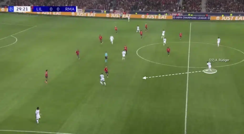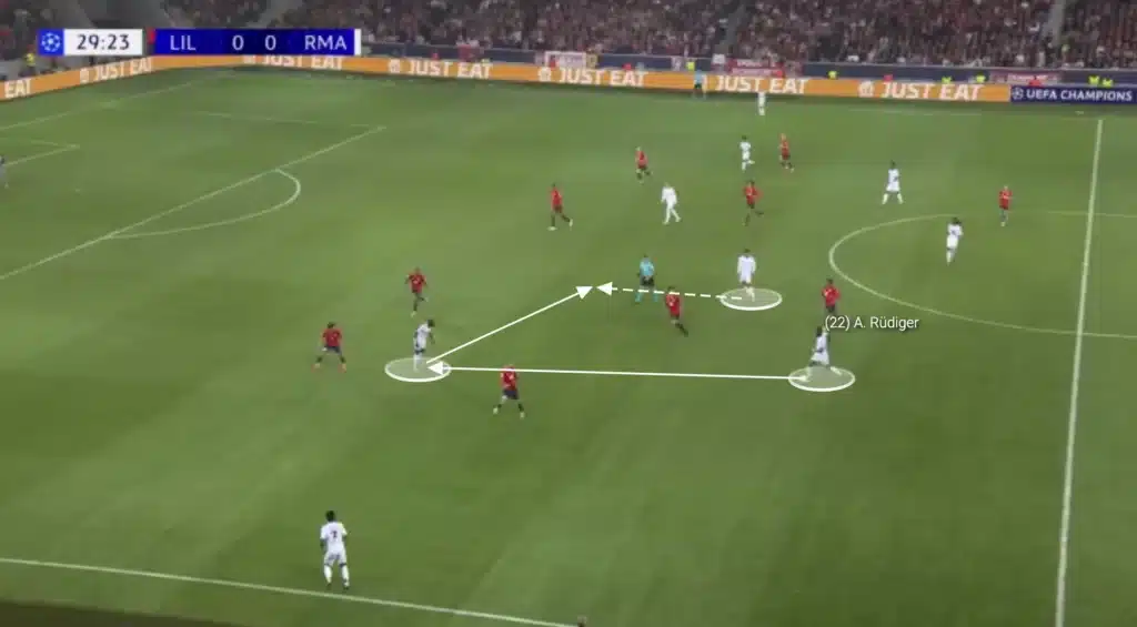 In this situation, for example, the Real Madrid center-back takes the ball forward diagonally, shifting the opposition structure and opening space to find a player in between the lines. This player can then lay the ball off to a forward-facing midfielder, who can attack the opposition backline.